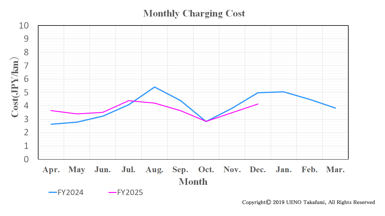 EV charging cost is expressed by JPY (Japanese Yen)/km. The following figure shows the measured Monthly EV Charging Cost including consumption TAX, Renewable energy Levy and Fuel cost adjustment.