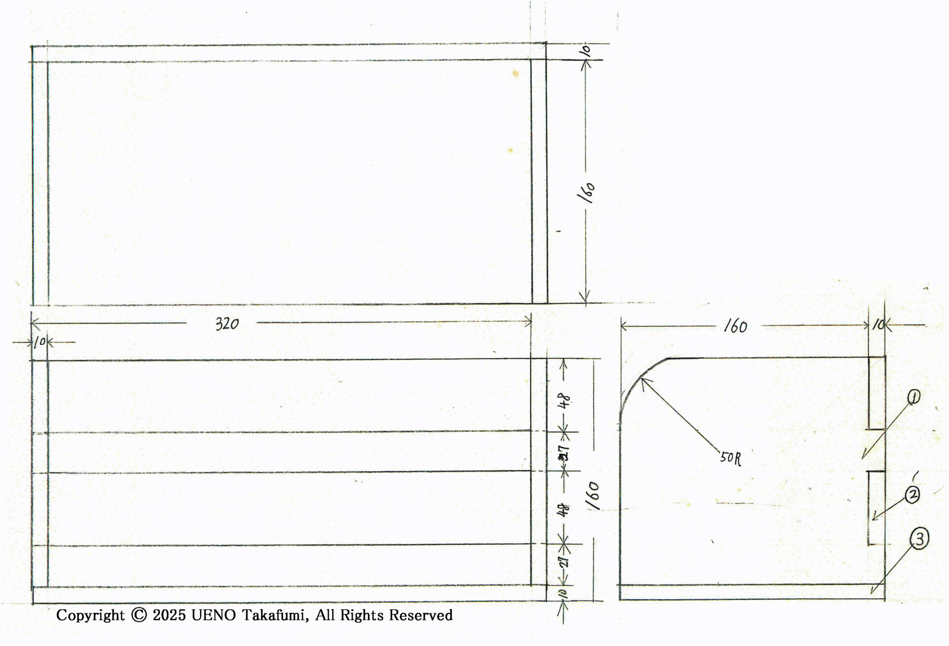 Claude+マニュアル設定。別稿(生成AIの比較)にも示したようにAIでは図面の読み取りによる立体モデル作成がうまくいかなたったので、ここでは製図の図面を元にBlenderで3Dモデルの作成を試みた。何回もやり取りの結果成功した。下図は筆者が中学1年の時に製図を習い始めたときの最初の図面で最も簡単な卓上本立てである。これを原画とする。
